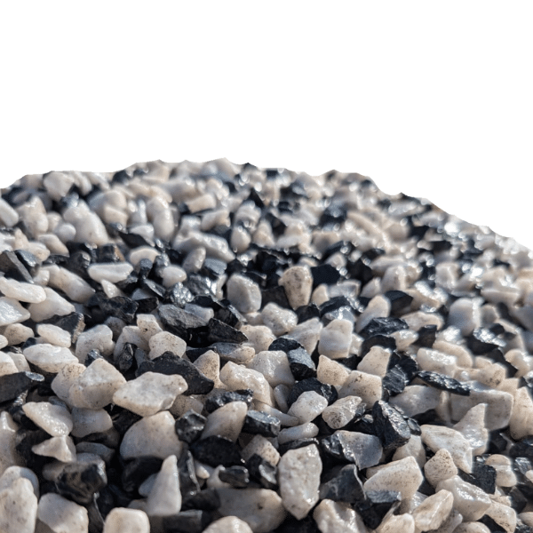 Les éléments blancs du mélange réfléchissent la lumière naturelle avec un éclat presque cristal et apportent de la luminosité aux zones ombragées du jardin. Les fragments noirs absorbent la chaleur et créent une profondeur visuelle. Ensemble, ils produisent un effet dynamique qui évolue selon l’éclairage et les saisons. Ce gravier décoratif bicolore surpasse largement les graviers unis en termes d’impact visuel.